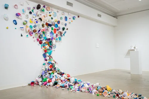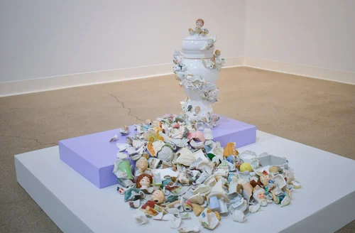 This work, created during a Studio Works Residency at the Tides Institute and Museum, was an exploration of grief, connection, and collaboration through found objects. Community members, tourists, and patrons were welcomed into the studio while the work was being made and were invited to break a figurine. The broken pieces were then embedded into hand-built objects and glazed.