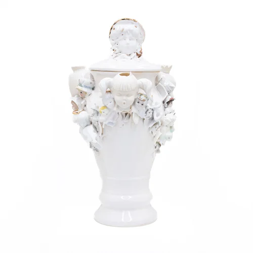 This collection of urns has been assembled with the addition of found ceramic objects foraged primarily from estate sales, thoughtfully broken to retain certain features or imagery, and reassembled into new works. Each piece, carefully combined with a mix of items collected throughout decades by strangers, challenges the perception of what is “whole” and “perfect”. This work is a continued exploration of how parts of ourselves and loved ones become attached to objects through memory and sentiments and how connections to others are preserved after death or separation.